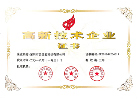 美佳愛科技高新技術(shù)企業(yè)認證證書